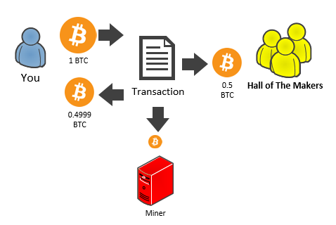 As the diagram shows below, your transaction output specifies 0.5 BTC to Hall of The Makers and 0.4999 back to you.
